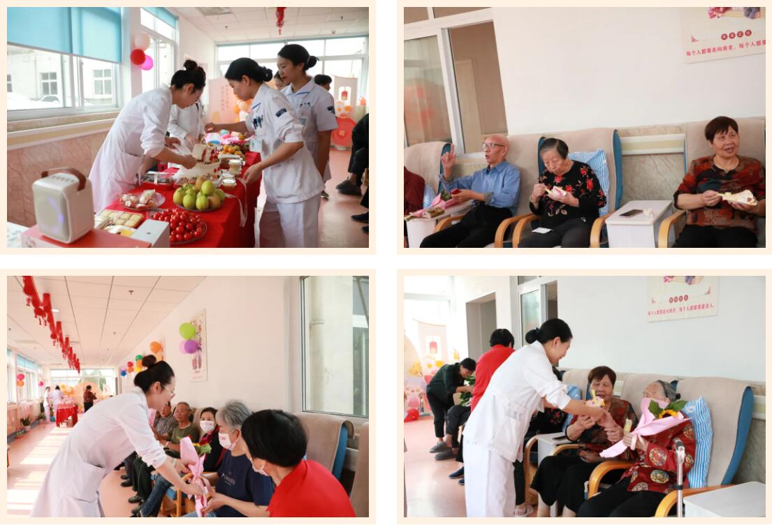 頤養(yǎng)院的醫(yī)護(hù)人員們?cè)谧o(hù)理部領(lǐng)導(dǎo)的帶領(lǐng)下帶著滿心的關(guān)懷與溫情,為院內(nèi)的老人們送去了精心鮮花和水果糕點(diǎn)。工作人員們拉著老人的手,耐心詢問(wèn)他們的身體狀況,以及是否有什么特別的需要或愿望,那份耐心與真誠(chéng),讓老人們臉上洋溢著幸福的笑容。