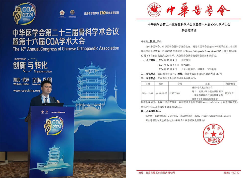 初冬時(shí)節(jié),來(lái)自海內(nèi)外的頂尖專(zhuān)家、骨科同道齊聚江城,中華醫(yī)學(xué)會(huì)第二十三屆骨科學(xué)術(shù)會(huì)議暨第十六屆COA學(xué)術(shù)大會(huì)于12月5日在湖北武漢啟幕。來(lái)自海內(nèi)外及中國(guó)內(nèi)地、港澳臺(tái)地區(qū)的參會(huì)人員1.86萬(wàn)人,我院羅軍副院長(zhǎng)受邀參加此次盛會(huì)并作大會(huì)學(xué)術(shù)發(fā)言。