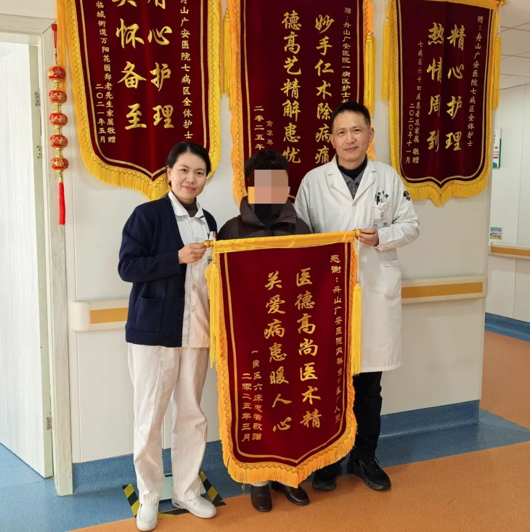在內(nèi)科病區(qū)里,懸掛著眾多錦旗,總在無聲訴說著醫(yī)患間的溫情故事。近日,兩位與病魔抗?fàn)幎嗄甑睦先耍眉t綢金字的錦旗,為這個充滿愛心的醫(yī)療團隊寫下最誠摯的注腳。
