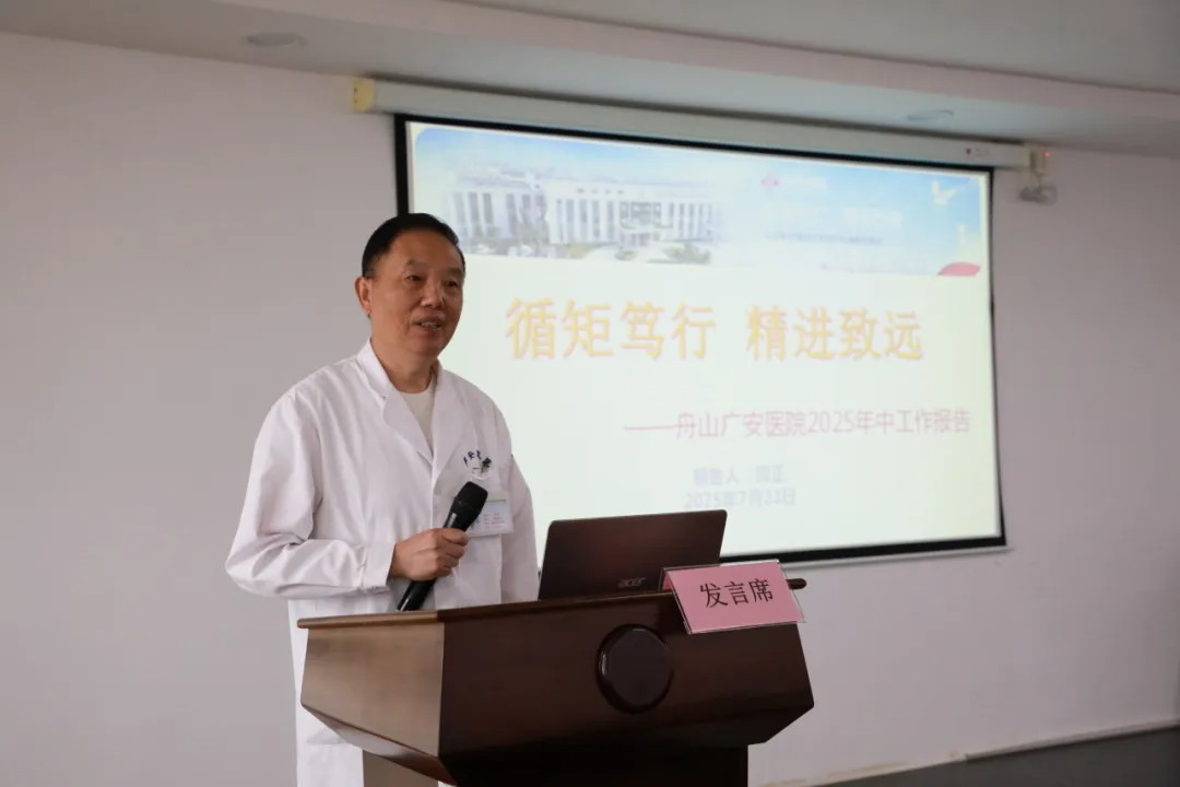 7月23日,舟山廣安醫(yī)院2025年年中工作會議順利召開。本次會議以“循矩篤行 精進致遠”為主題,全面總結(jié)上半年工作成效,分析存在問題,并部署下半年重點工作任務(wù)。院領(lǐng)導(dǎo)班子、各科室負(fù)責(zé)人及科室骨干人員參加了會議。