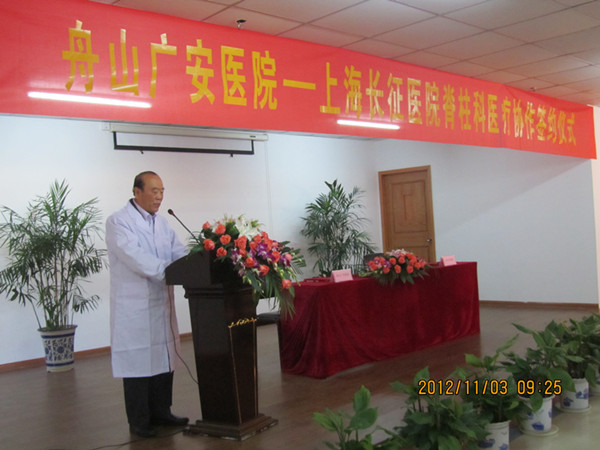 為了解決舟山海島群眾看病難,看名醫(yī)更難的難題,經(jīng)前期各項準(zhǔn)備,我院與上海長征醫(yī)院賈連順教授的專家團(tuán)隊將進(jìn)行長期定向協(xié)作,并于2012年11月3日上午隆重舉辦了協(xié)議簽訂暨專家首診儀式。上海長征醫(yī)院賈連順教授、邵將教授、錢列教授等專家出席本次簽約儀式,我院郭維杰院長、劉志安副院長以及全體工作人員共同參與本次簽約儀式,舟山市社保局醫(yī)療工傷管理中心石主任、普陀區(qū)衛(wèi)生局汪副局長以及海氏集團(tuán)領(lǐng)導(dǎo)也共同參與,并有多加媒體進(jìn)行拍攝采訪。