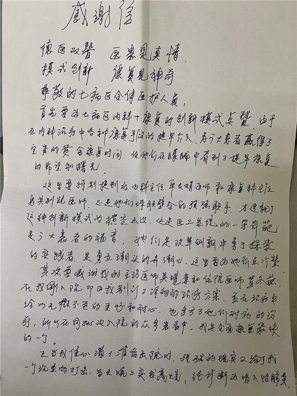 正如張大爺信中所言,是廣安醫(yī)院治療+康復(fù)的創(chuàng)新治療模式,為廣大患者贏得了寶貴的黃金康復(fù)時(shí)間。是內(nèi)科和康復(fù)科醫(yī)生的珠聯(lián)璧合、強(qiáng)強(qiáng)聯(lián)手,讓患者們相信康復(fù)的曙光就在眼前。
