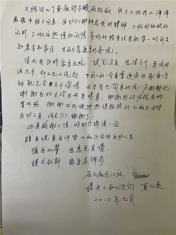8月17日上午,在出院前,張大爺將一封手寫的感謝信及兩面錦旗分別交到了在他住院期間悉心醫(yī)護(hù)他的醫(yī)護(hù)人員的手上,以感謝他們?cè)谶@半年多來的盡心救治與關(guān)懷。