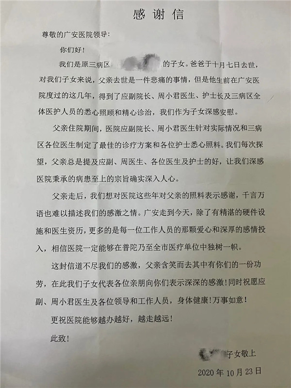 “父親去世是一件悲痛的事,但是他生前在廣安醫(yī)院度過的這幾年,得到了應(yīng)副院長、周小君醫(yī)生、護(hù)士長及三病區(qū)全體醫(yī)護(hù)人員的細(xì)心照顧和精心診治,我們作為子女深感安慰……”