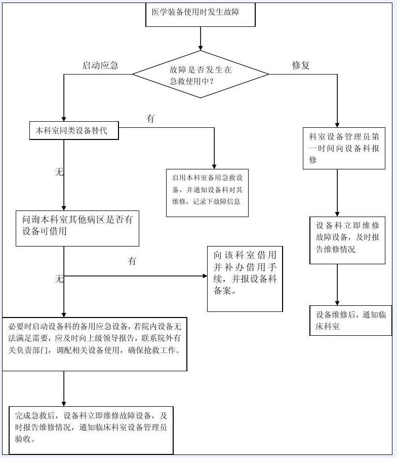 5.7設備科根據(jù)故障性質(zhì)程度,決定是否由其他相關(guān)科室調(diào)撥裝備或院外借用,以保證病人的救治,使裝備故障對病人救治造成的影響程度降至最低。