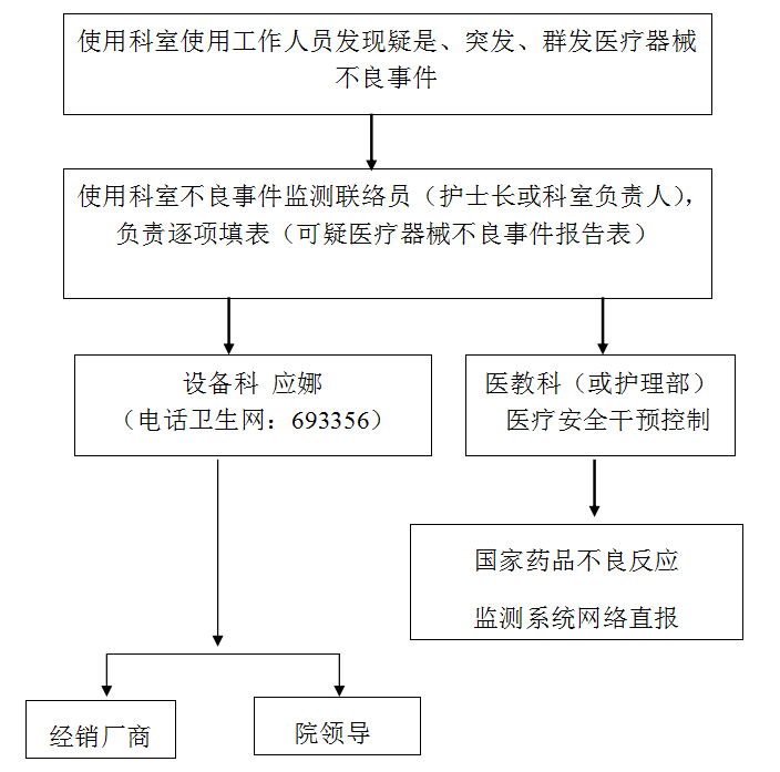 5.2.1全院各臨床科室發(fā)現(xiàn)醫(yī)療器械突發(fā)性群體不良事件時,應及時向設備科辦公室報告,不得瞞報、遲報或授意他人瞞報、遲報。